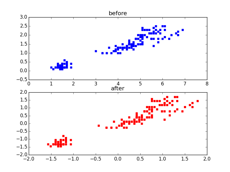 #!/usr/bin/python# -*- coding: utf-8 -*-importpandas.rpy.commonasprcimportnumpyasnpfromscipyimportstatsimportmatplotlib.pyplotasplt#各種毎に違うMarkerをつけるための関数を作りたかった#(上手くできず挫折)if__name__=='__main__':x=prc.load_data("iris")printxx=np.array(x)#print x print"--"#0.Sepal.Length #1.Sepal.Width #2.Petal.Length(花弁の長さ)#3.Petal.Width(花弁の幅)#4.Species#平均値pl=np.array(x[:,2],dtype=float)print"Petal.Length Average "+str(np.average(pl))pw=np.array(x[:,3],dtype=float)print"Petal.Width Average "+str(np.average(pw))word=np.array(x[:,4],dtype=object)#共分散行列conv=np.cov(x[:,2:4],rowvar=0)print"Convariance matrix\n"+str(conv)plt.axis('scaled')#標準化前plt.subplot(211)plt.title("before")plt.scatter(x[:,2],x[:,3],marker='s',color='b')#標準化後z=np.array(x[:,2:4],dtype=float)z=stats.zscore(z,axis=0)#標準化plt.subplot(212)plt.title("after")plt.scatter(z[:,0],z[:,1],marker='s',color='r')plt.savefig("iris_43.png")#画像保存plt.show()